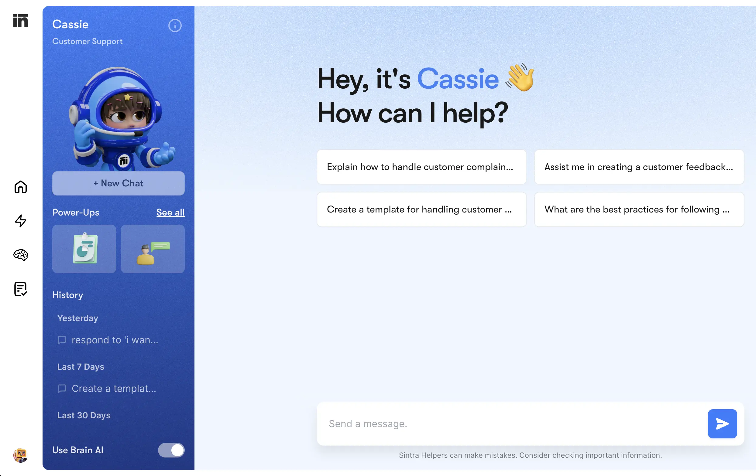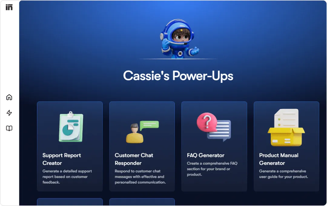 Cassie can automate your work even more with power-ups. Power-ups can enable Sintra helpers to connect to platforms or do more, with less. Cassie uses AI tools to deliver automated responses and enable self service options, allowing users to resolve issues independently and efficiently. These power-ups act as customer service solutions, with each one being an AI solution designed to enhance support and improve the overall customer experience.