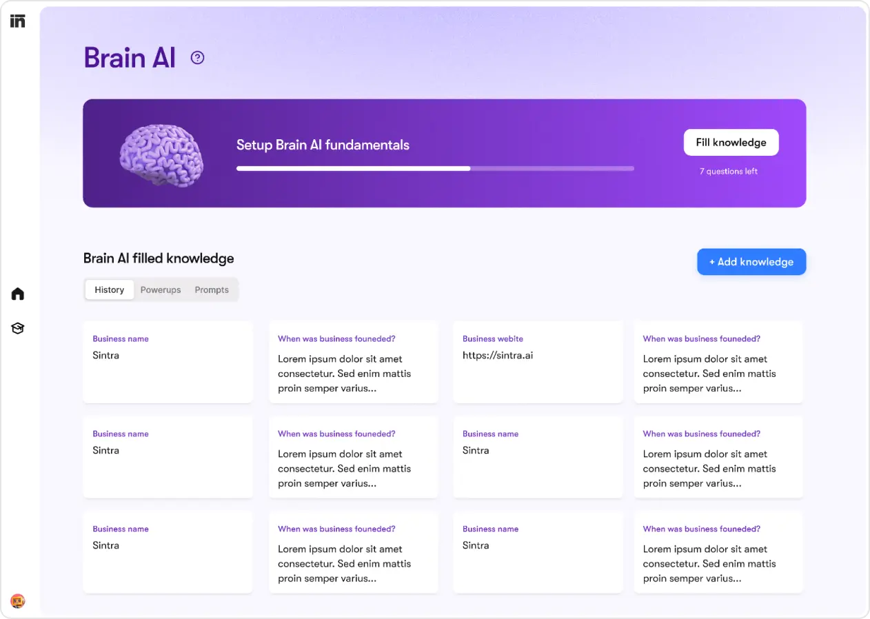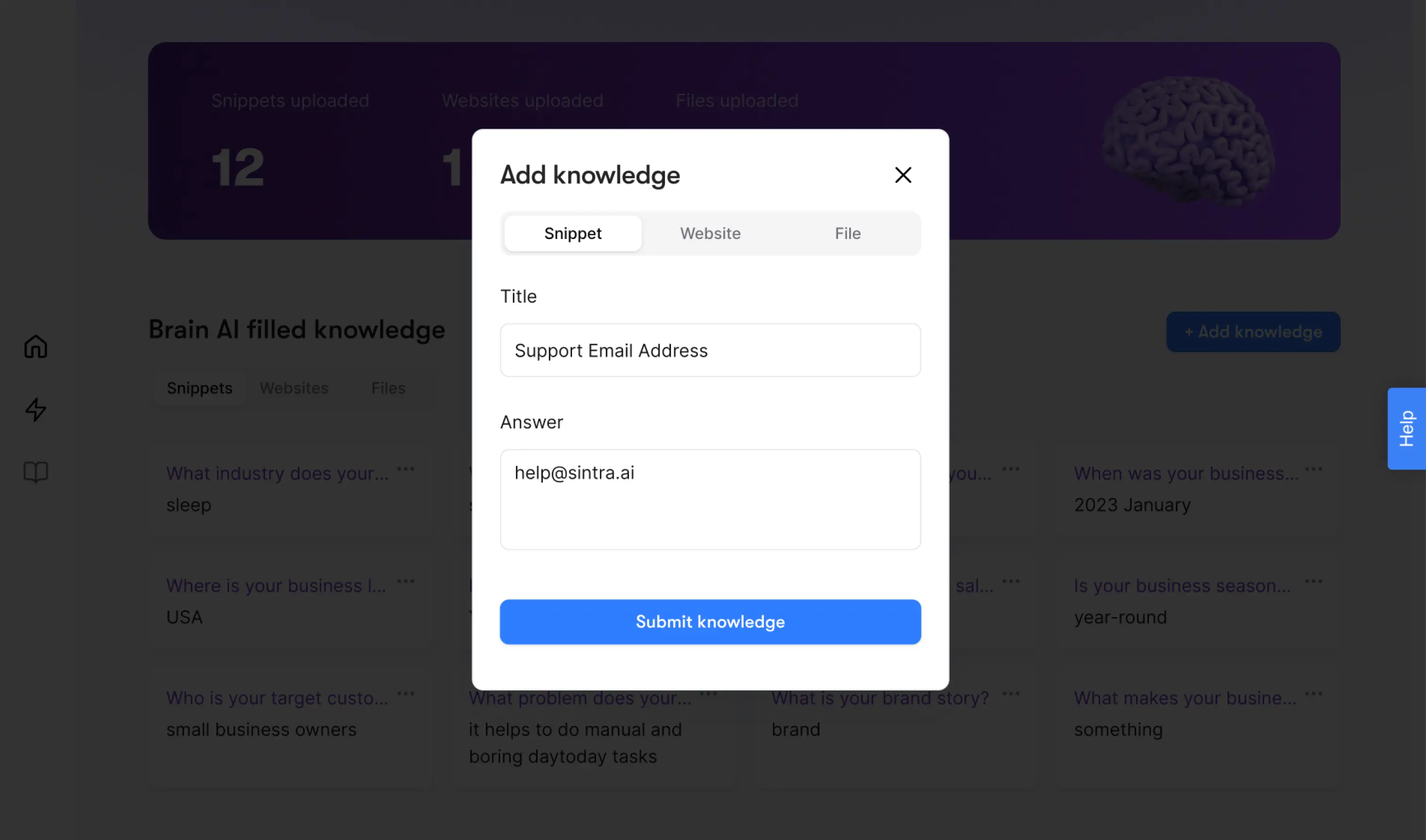 Fill your Brain AI at any time. Add extra knowledge, fill your brand info and let your helpers learn from you even more.