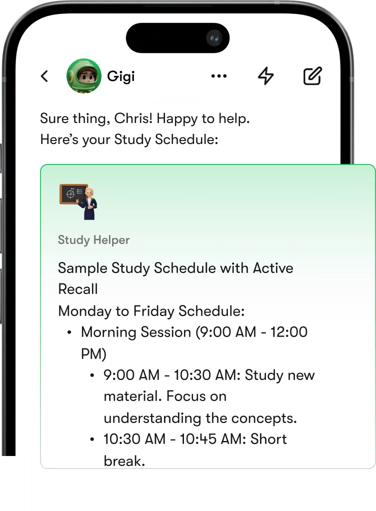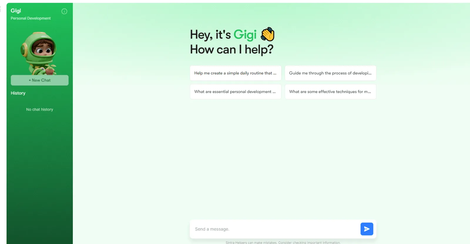 Meet Gigi, your AI personal assistant for personal development. Whether you need help planning meals, organizing study sessions, or building workout routines, Gigi is here to support your journey to a better self. Available at all times.