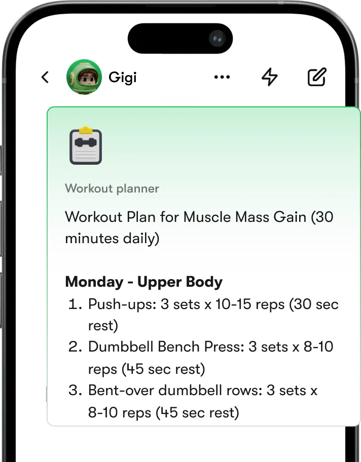 From building meal plans, to creating workout routines, to helping you study better – Gigi can help you grow faster by automating and streamlining these tasks with its advanced ability to manage and organize your routines.