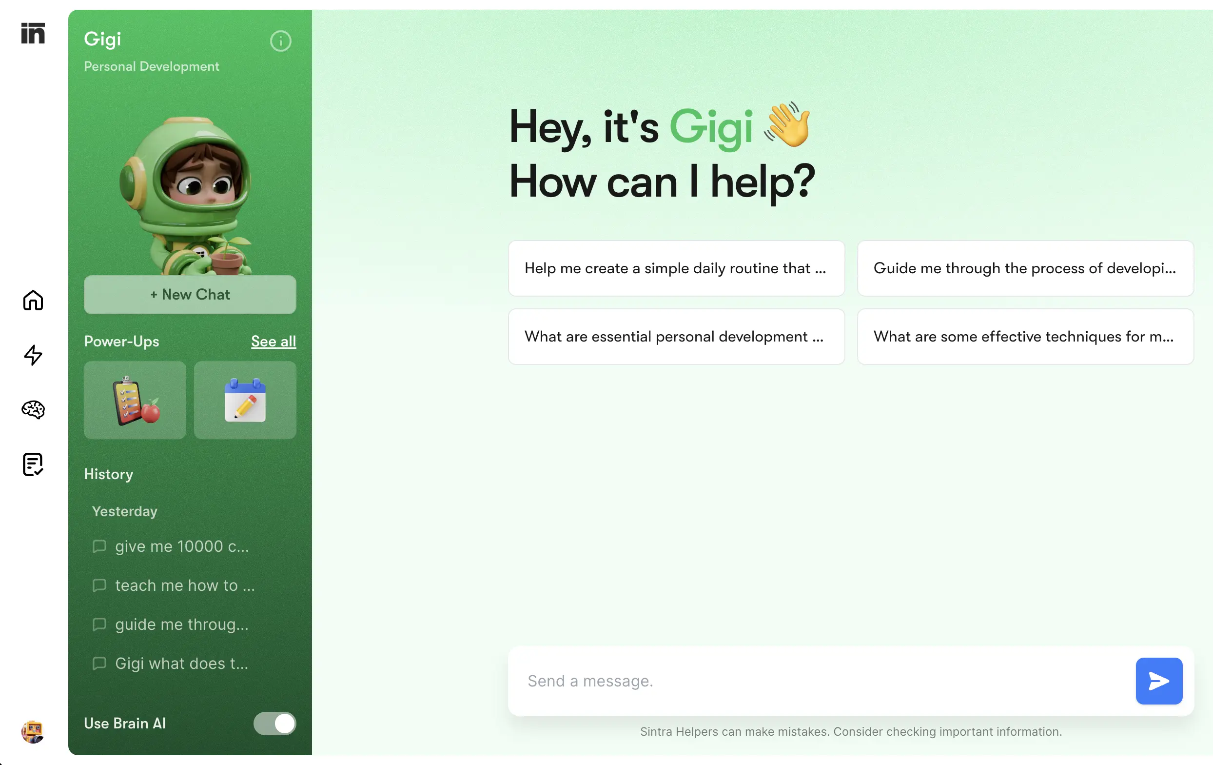 Gigi can automate your work even more with power-ups. Power-ups can enable Sintra helpers to connect to platforms or do more, with less. For example, Gigi can integrate with smart home devices, allowing you to automate and control your home environment directly through the assistant.