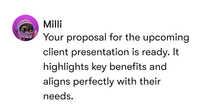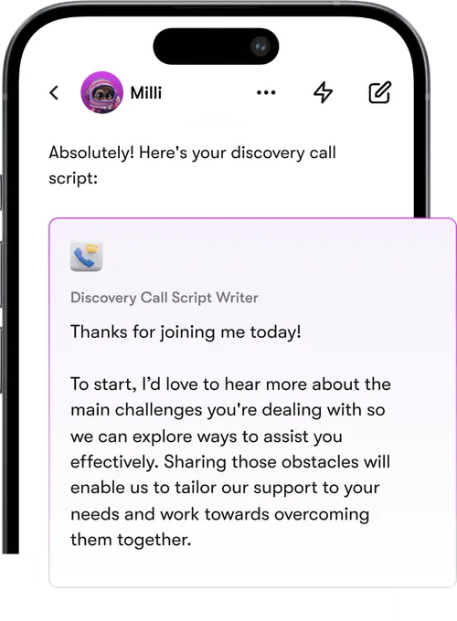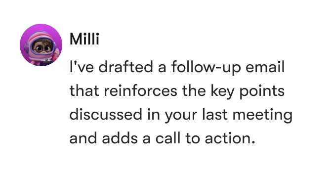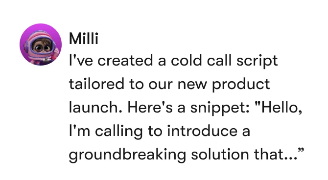 Milli specializes in crafting cold call scripts, designing cold emails, building proposals, and advising on negotiations. Milli is designed to support sales teams at every stage of the sales cycle, streamlining workflows and enhancing productivity.