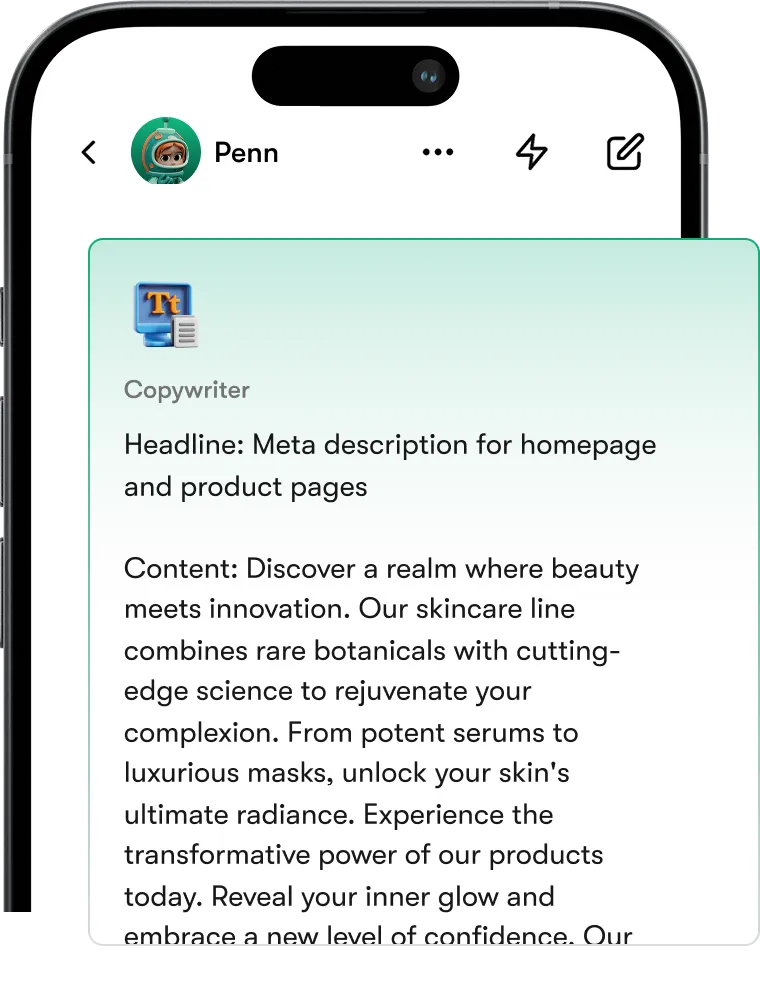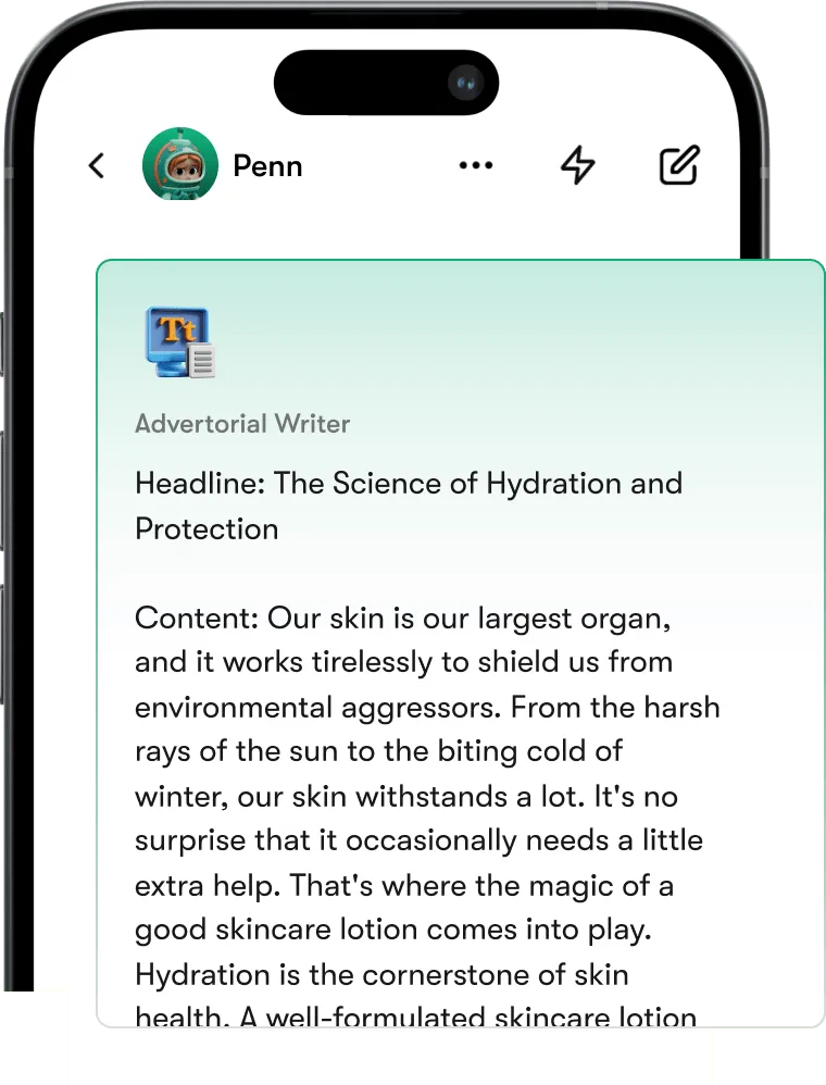 From social media content or detailed product descriptions, Penn handles a wide range of writing tasks with ease. Just ask, and Penn delivers the content in seconds. Penn can generate copy for a variety of needs, including creating several versions of new copy for A/B testing or comparison.