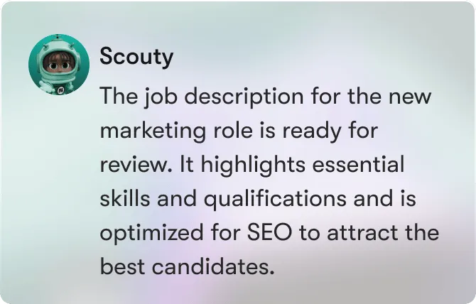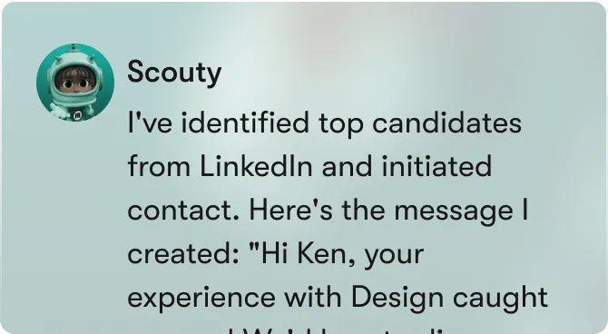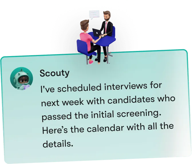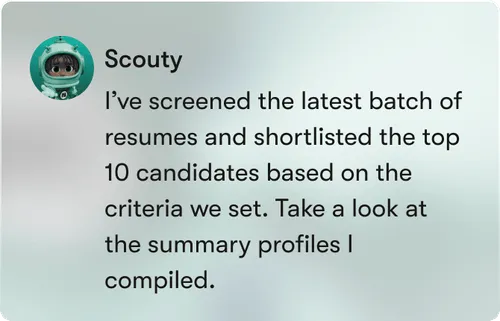 Scouty can handle thousands of recruitment tasks, from reaching out to potential candidates to ensuring a smooth onboarding process. Just ask, and Scouty delivers. By automating repetitive tasks, Scouty saves recruiters and hiring managers hours each week, streamlining the hiring process and boosting efficiency.